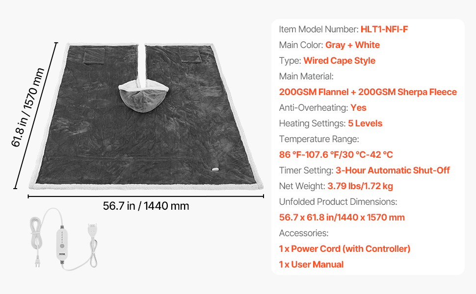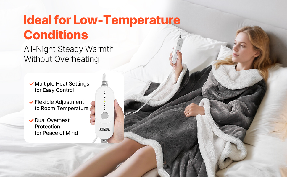 This portable heated blanket provides 1–5 heat settings from 86 °F to 107.6 °F (30 ℃–42 ℃). Built-in 3-hour auto shut-off plus dual overheating protection and flame-retardant heating wires make it reliable for all family use.