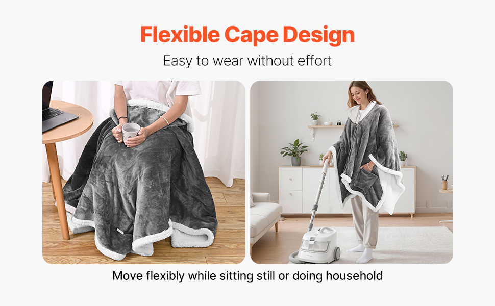- Wearable Hands-Free Design: Featuring a cape-style with magnetic or snap fasteners, this heated blanket is hands-free for chores, working, TV-watching, or quick outdoor use. The hidden side pockets enable easy access, keeping hands warm in winter