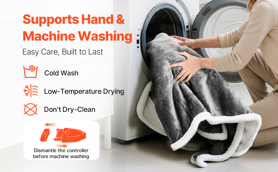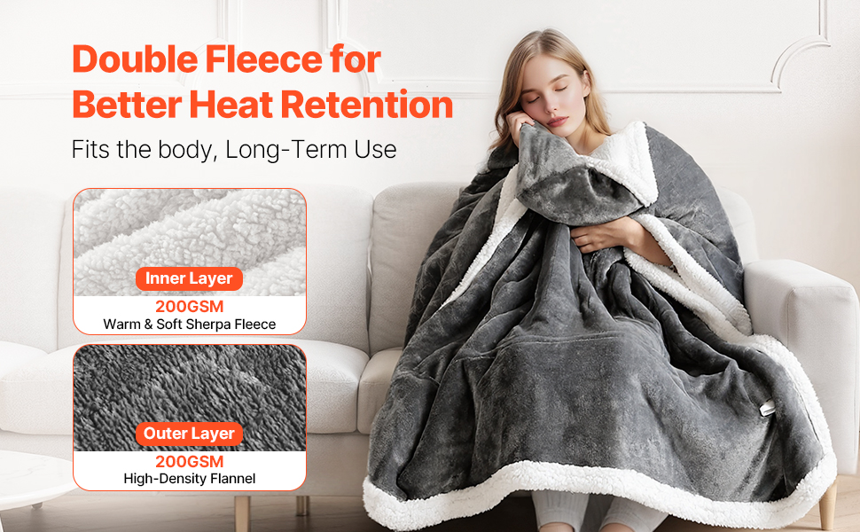 - Skin-Friendly Fabric: Made of 200GSM flannel outside and 200GSM sherpa fleece inside, this portable heated blanket delivers soft and itch-free warmth. It features dense stitching for long-lasting use and supports machine-washing without deformation